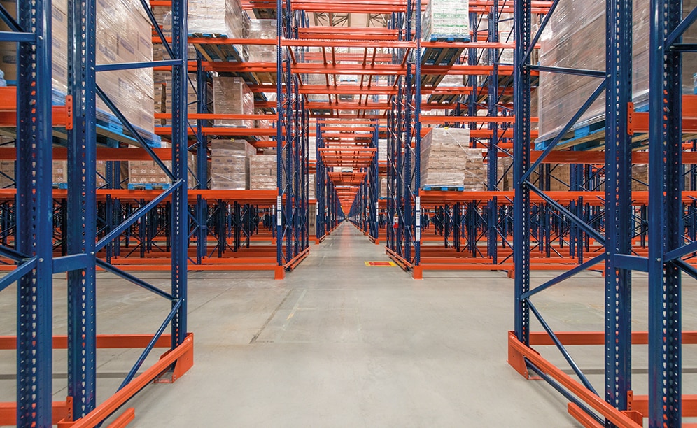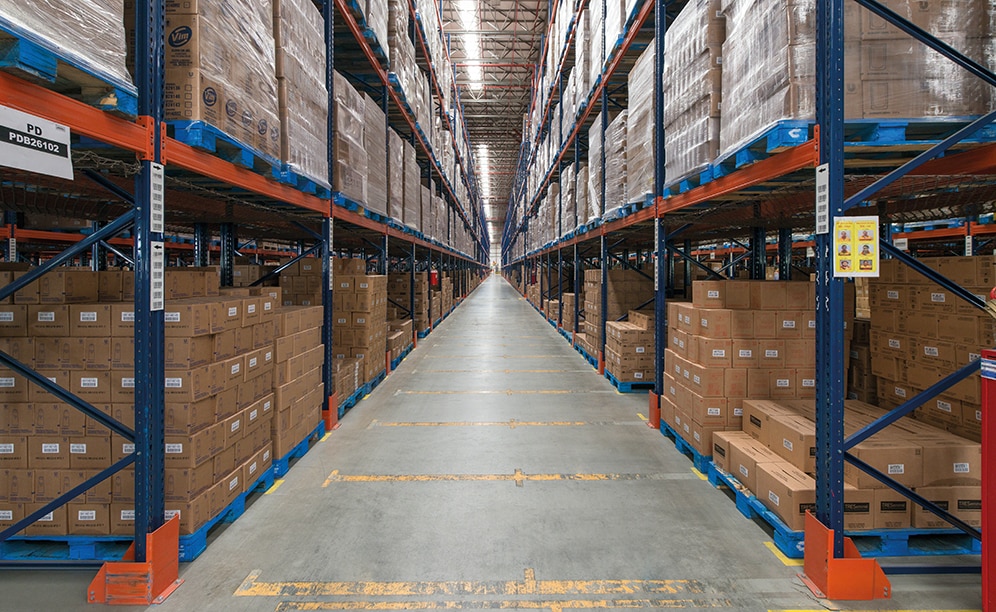 Mecalux ha suministrado racks selectivos de simple y doble profundidad de 11,4 m de altura, con cinco o seis niveles, y 152 m de longitud. En total, presentan una capacidad de almacenaje para 83.569 pallets de 1.000 x 1.200 mm.