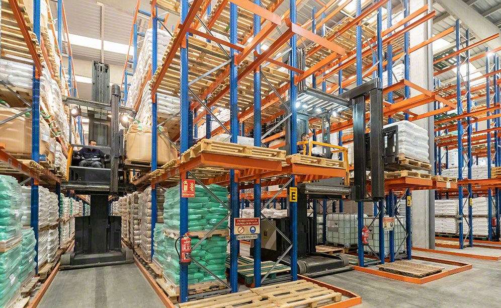 Algunos de los sectores del centro logístico están equipados con racks drive-in. Se trata de un sistema de almacenaje compacto formado por calles con hasta cinco niveles donde los operarios penetran en el interior con la carga elevada por encima del nivel en el que va a ser depositada.