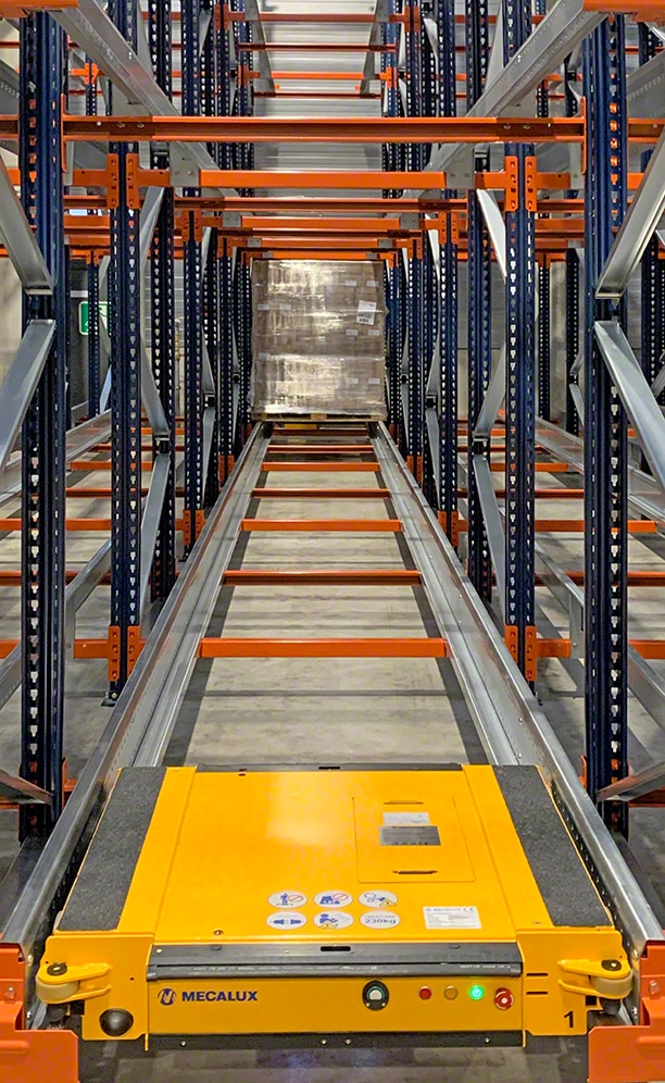 Mecalux ha instalado un bloque de racks de 29 m de longitud y 8 m de altura con el sistema Pallet Shuttle semiautomático. El bloque de racks ocupa tan solo 350 m2 y puede almacenar hasta 1.120 pallets.